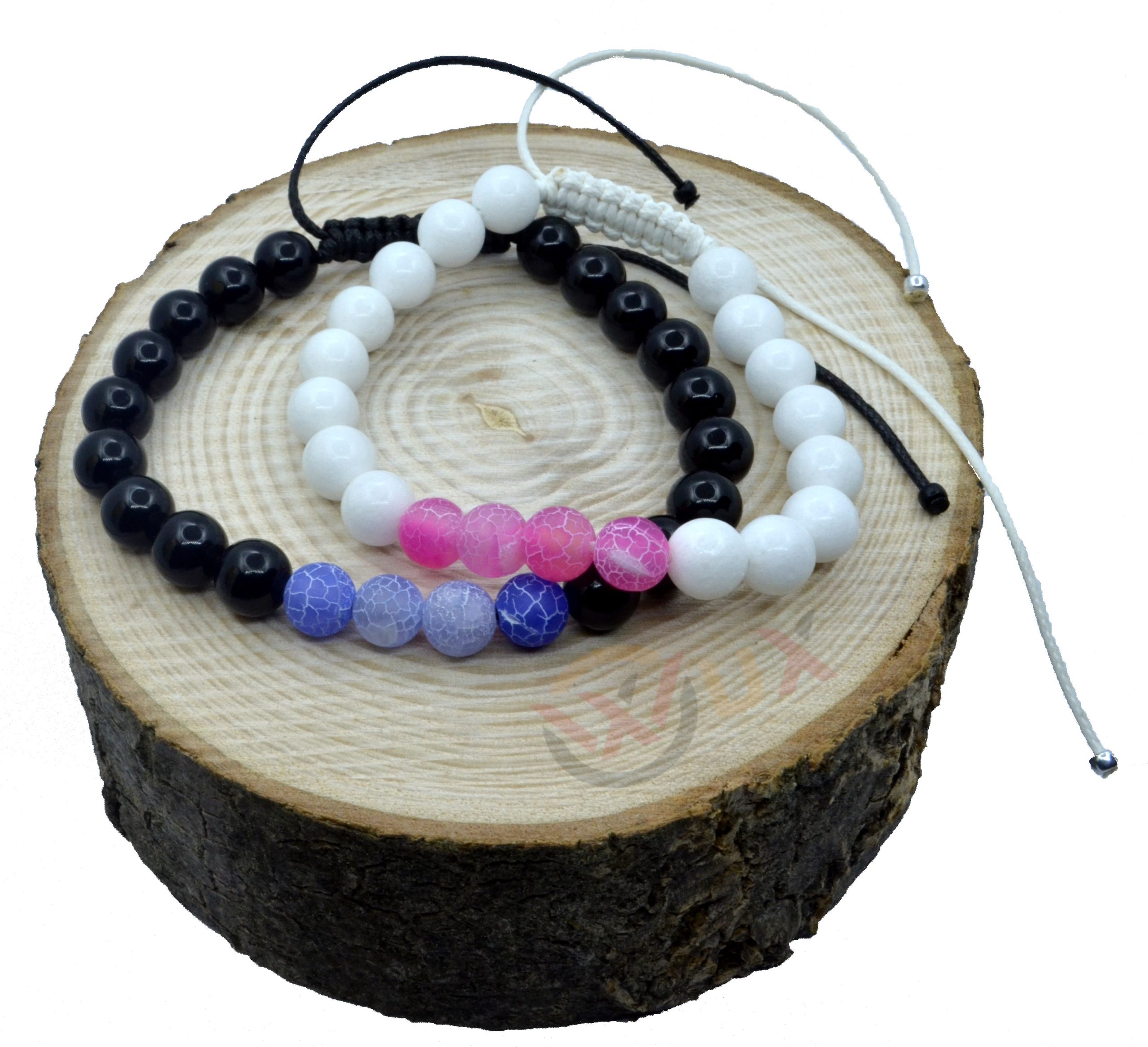 Párové náramky z minerálu kamene bílého Obsidiánu a černého Onyxu, spojeny korálky Praskané Růže a světle Modrého Praskaného Achátu s jednoduchým stahovacím zapínáním.