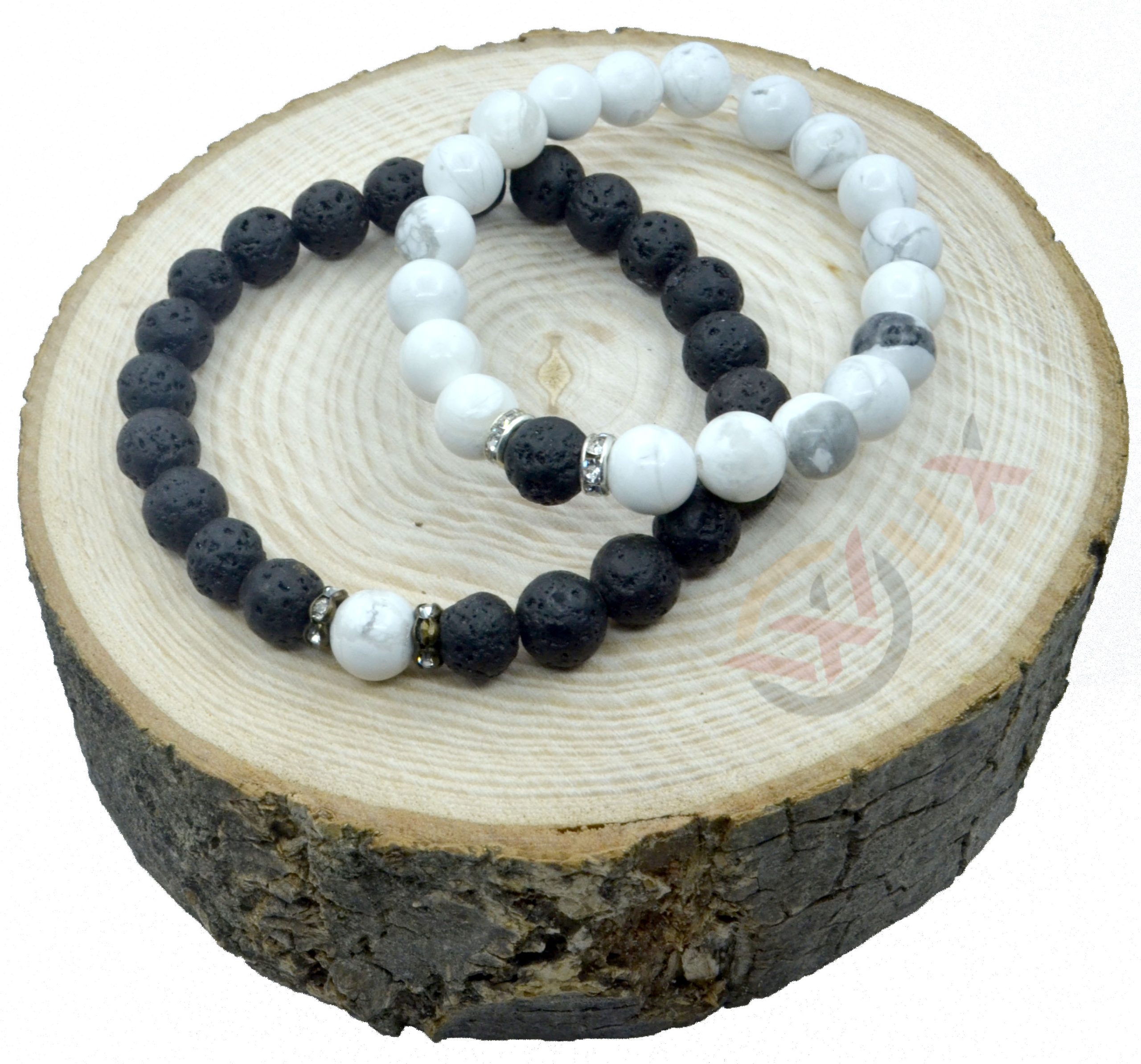 Párové náramky ve stylu Black and White z minerálního kamene bílého Howlitu a kamene Černé Lávy, doplněny o kovové korálky ve tvaru rondelky s broušenými kamínky.