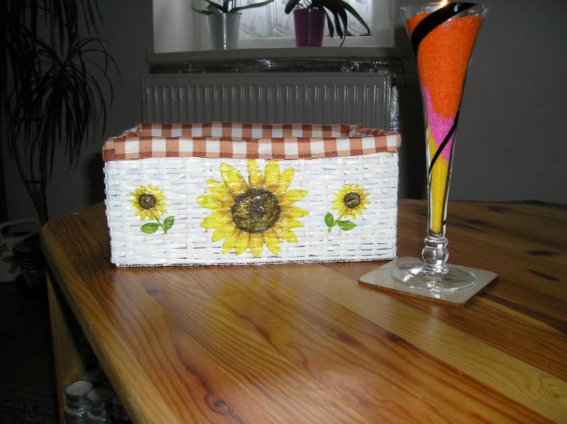 Pletený košík zdobený slunečnicí,tzv.decoupage.