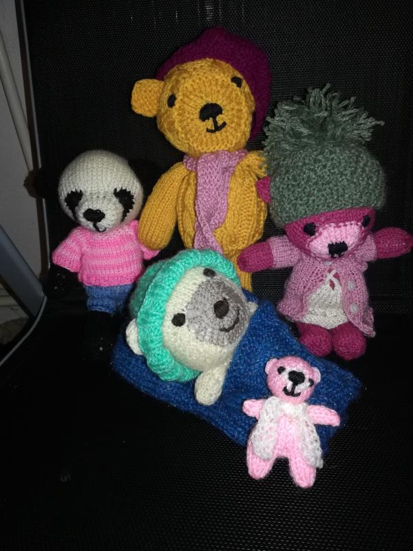 Medvídci jsou upleteni z akrylové příze a vyplněni umělou stříží. Vysocí jsou cca 25cm. Lze prát, raději opatrně ručně. Stejně tak doplňky, čepice, šála, kraťasy, svetřík, spacák. Cena je za jednoho medvídka.