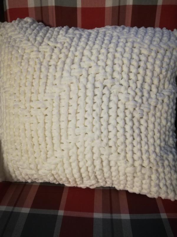 Povlak na polštář je zhotoven z měkké příze s oky, zadní část polštáře je látková. Rozměr je cca 40x40cm. Barvu a vzor lze přizpůsobit podle přání.