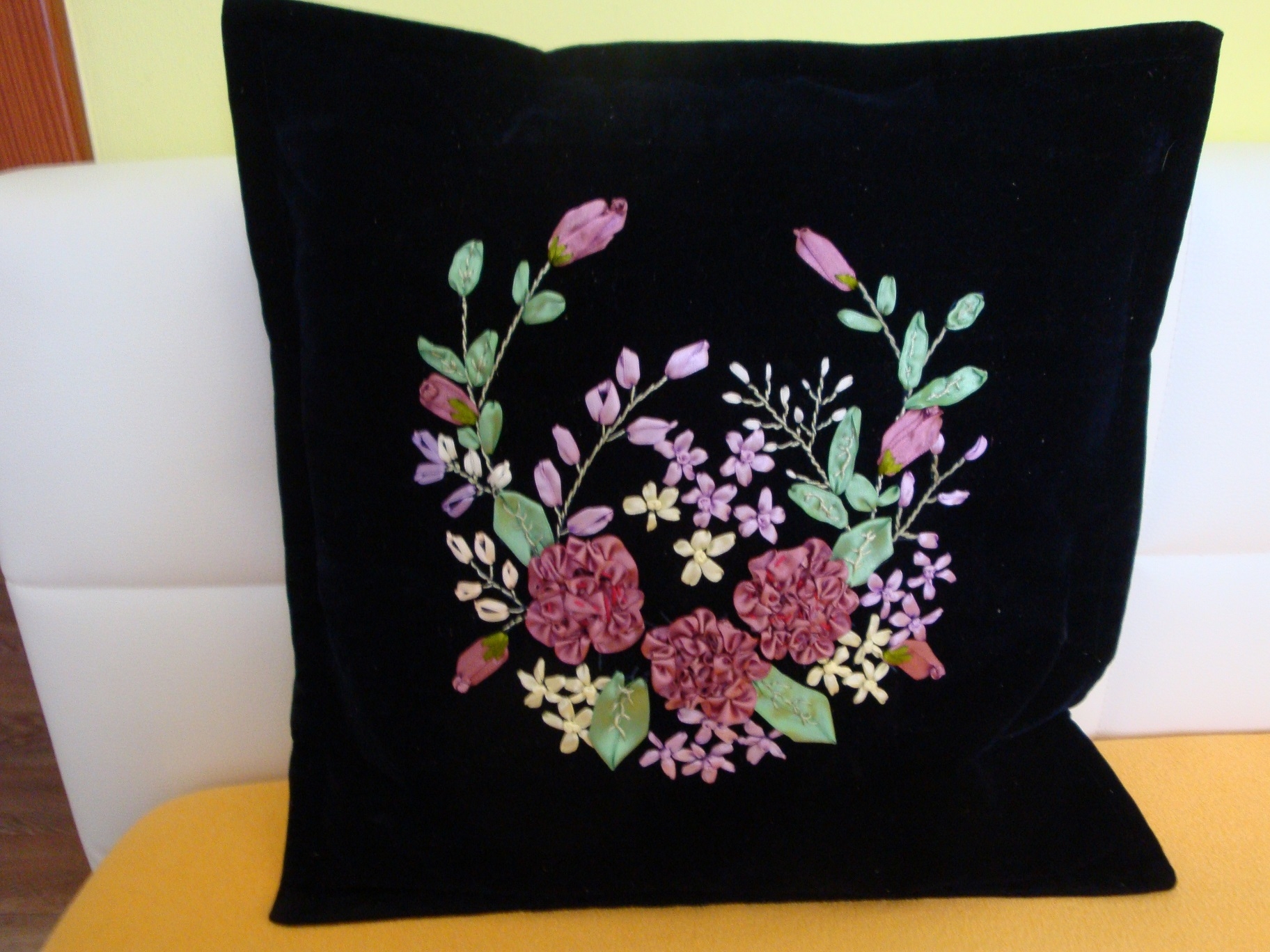 Ručně vyšívaný povlak na polštářek technikou stužková výšivka. Každá výšivka je originál. Použité stuhy jsou hedvábné, materiál polštářku pevný samet. Rozměry 55 x 55 cm, na zadní straně zip. Pokud máte rádi originalitu a kvalitu, jistě oceníte. Dle požadavků klienta je možné zhotovit i jiné vzory, která ráda zašlu emailem. Dodací lhůta, pokud zboží nemám na skladě, je cca 2 – 3 týdny.