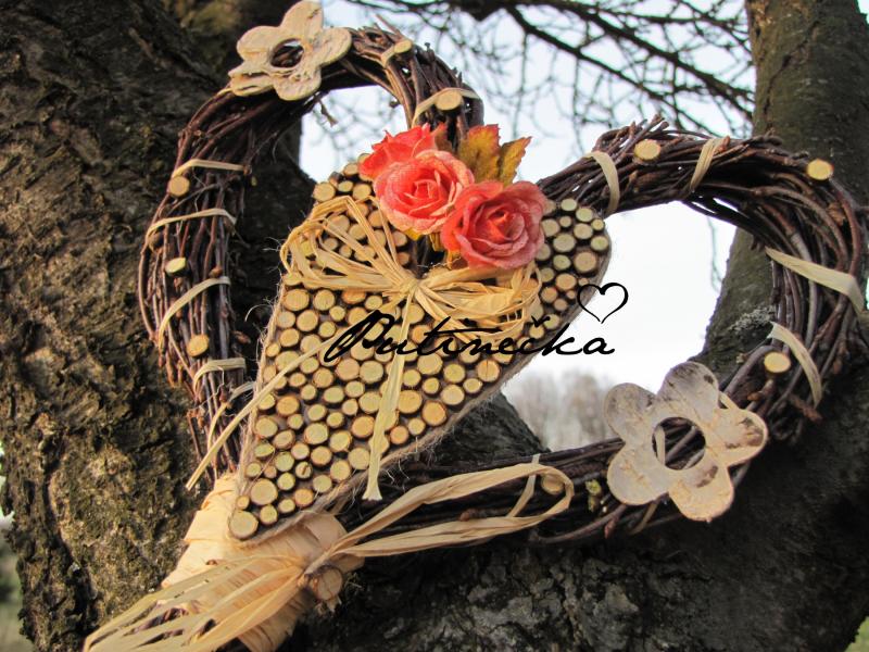 Srdíčko je umotáno z březových větví.Dozdobené malým špalíčkovým srdíčkem , papírovými růžičkami ,lýkem a kytičkami z březové kůry.Srdíčko je 23cm velké a 24 široké.