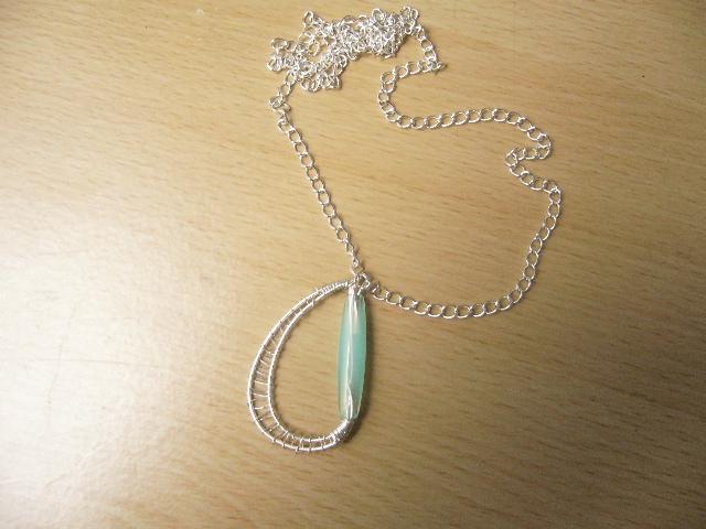 Vyrobeno ze silne postříbřených drátků (7 g Ag/1 kg a zelene perly ve tvaru kapky.Pouzita technika Wire wrapping.