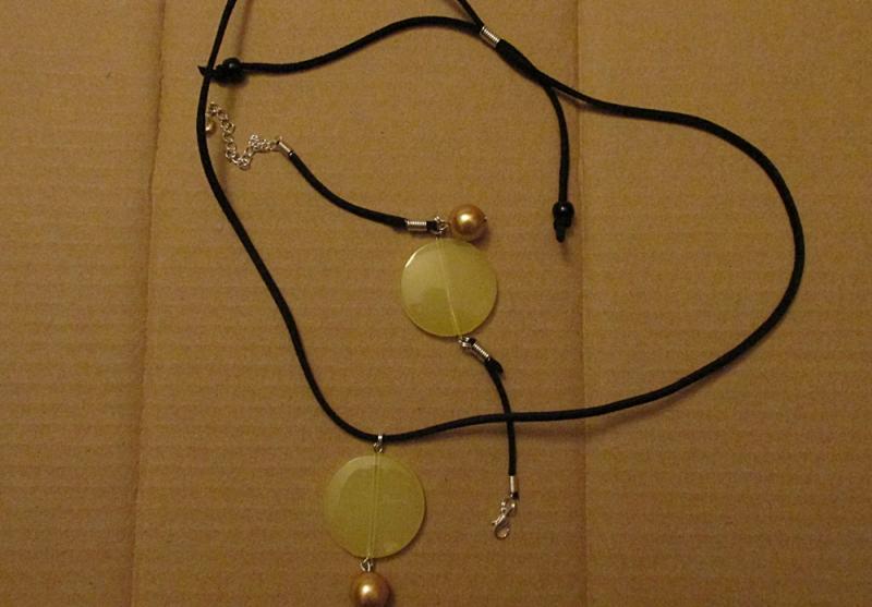 Přívěsek na kožence – na černé kožence žlutý, kulatý (3 cm v průměru), placatý korálek dozdoben perličkou zlaté barvy, délky á 72 cm. Náramek je dělán do stejné podoby s možností prodlouženého zapínání.