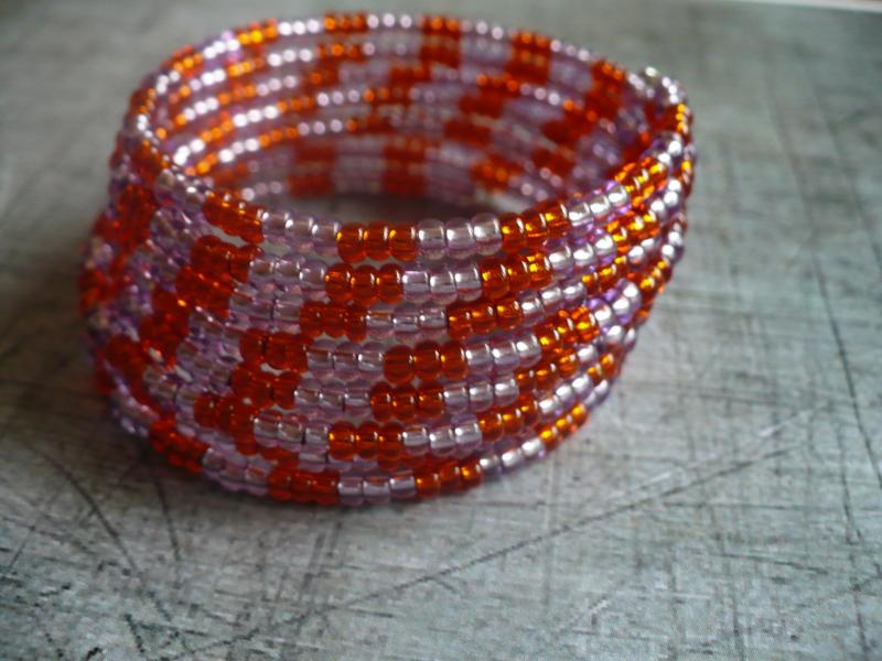 Dětský náramek je vyroben z kvalitního českého rokailu zn. Preciosa, barvy oranžové tmavé průhledné s průtahem a fialové tmavé s průtahem, navlečeném na paměťovém drátu. Délka 8 otoček, průměr 5 cm, šířka 2,5 cm.