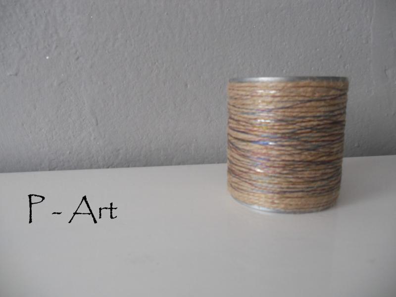 Dóza je omotána jutovým provázkem ( je na dozu přilepen lepidlem) a následně barevnou lesklou nití.