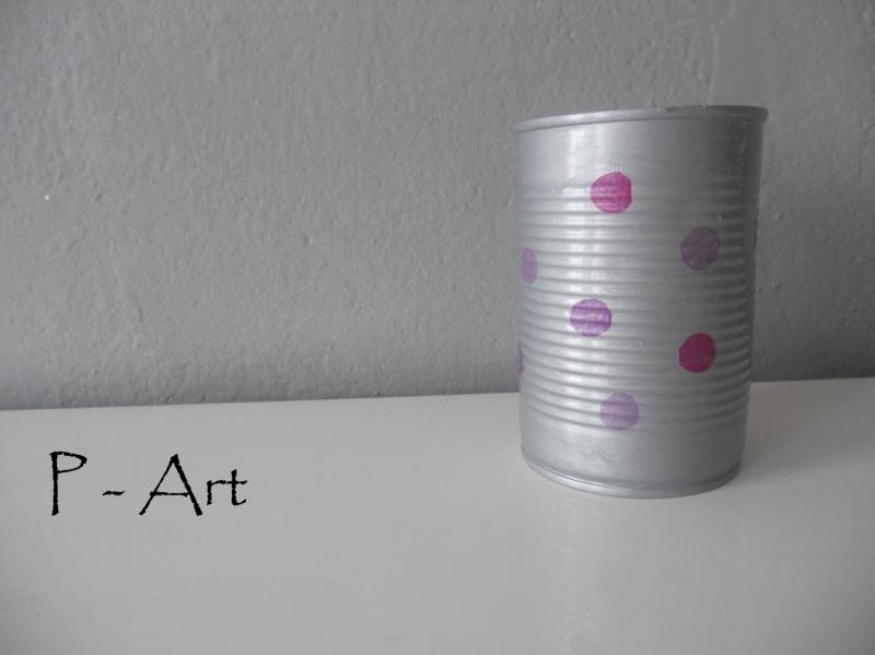 Dóza je nalakována stříbrně, tečky vytvořeny metodou decoupage a celé je to přelakováno bezbarvým lakem.