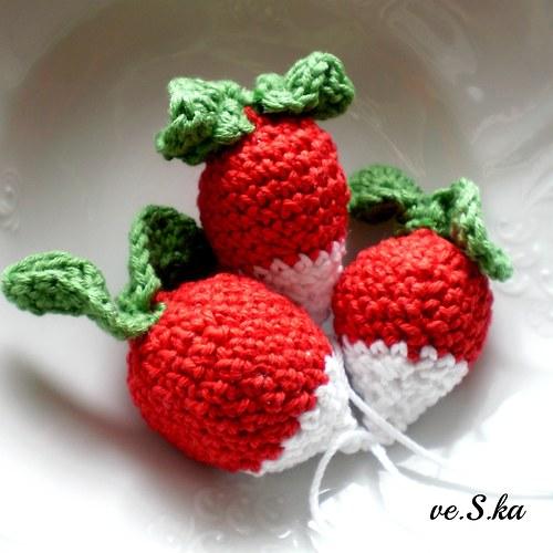 Háčkovaná sada tří ředkviček ze 100% bavlněné příze v červené a bílé barvě, plněné vatelínem. Vypadají jako pravé díky kořínku a zeleným lístečkům.