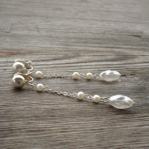 Náušnice jsou tvořeny z řetízku stříbrné barvy a bílých voskovaných  perliček a velkého krouceného bílého skleněného oválku.