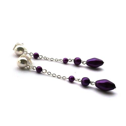 Náušnice jsou tvořeny z řetízku stříbrné barvy a fialových voskovaných perliček včetně velkého fialového oválku.