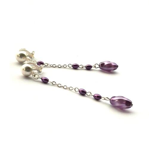 Náušnice jsou tvořeny z řetízku stříbrné barvy a světle fialových drobounkých voskovaných oválných perliček a velkého krouceného světle fialového skleněného oválku.