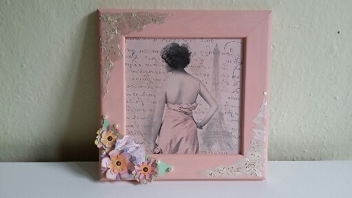 Obrázek o velikosti 24 x 24cm. Rám obrázku je nabarven lososovo- perleťovou barvou a ručně nazdoben tvrdnoucí pastvou v barvě šampaň , papírovými kytičkami , perličkami a kouskem krajky. Obrázek je vytvořen metodou decoupage.