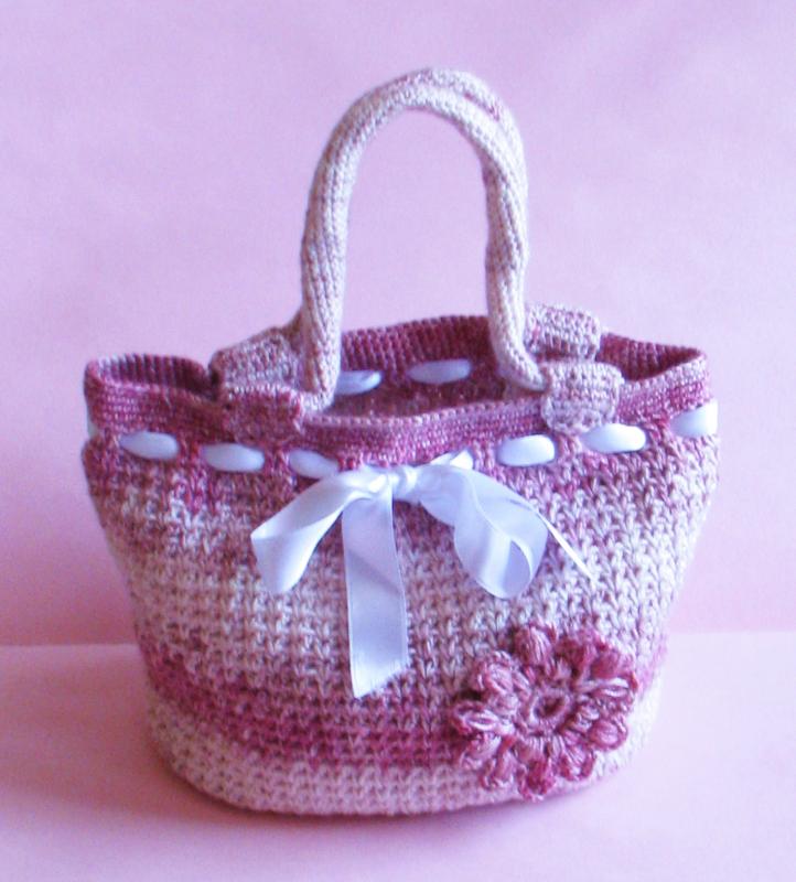 Háčkovaná růžová kabelka s kytičkou a bílou stuhou.