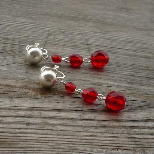 Červené broušené skleněné korálky jsou zavěšeny na klipsovém zapínání – na toto zapínání není potřeba mít propíchnutá ouška.