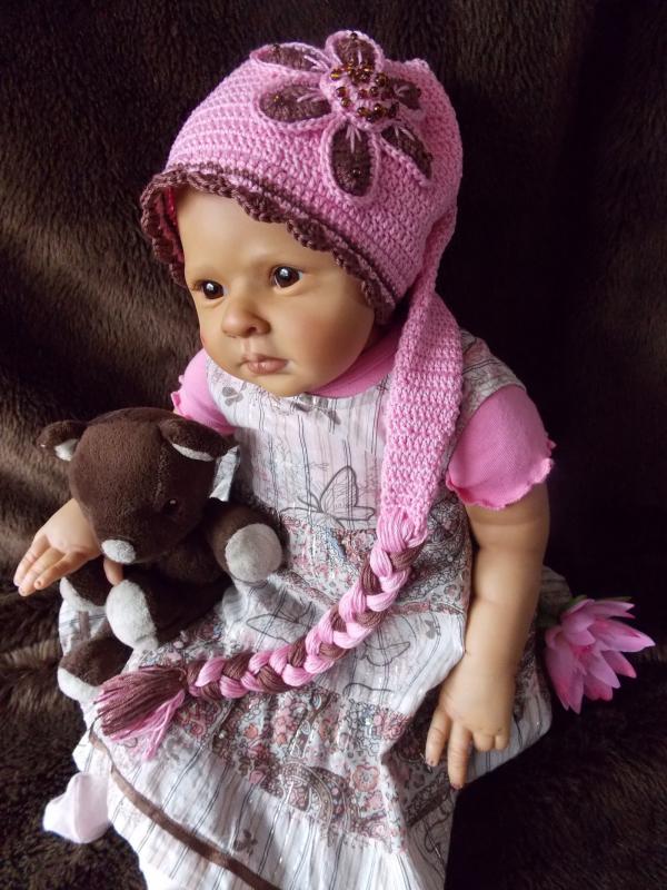 Tato čepička je uháčkovaná z bavlněné příze, zdobená hnědou květinkou a perličkami a holčičkám moc sluší.