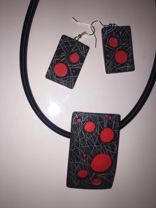 Sada náhrdelníku a náušnic – výrazná barevná kombinace černé a červené s jemným bílým žíháním.