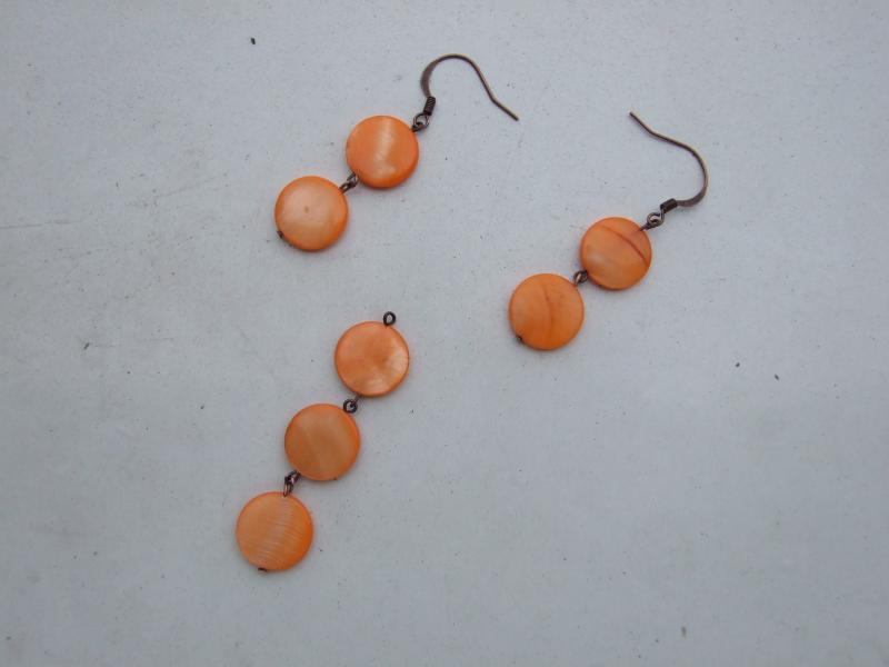 Sada náušnic a přívěšku z oranžové perleti placiček s měděnými komponenty.