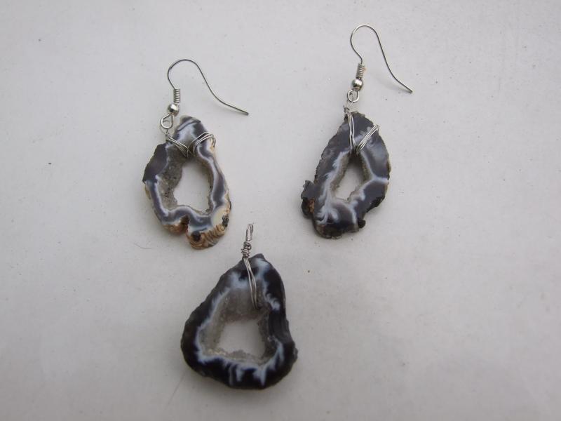 Náušnice i přívěšek jsou z plátků peříčkového achátu, jen zadrátované, takže nic neruší užít si prolínání barev z černé do bílé.
