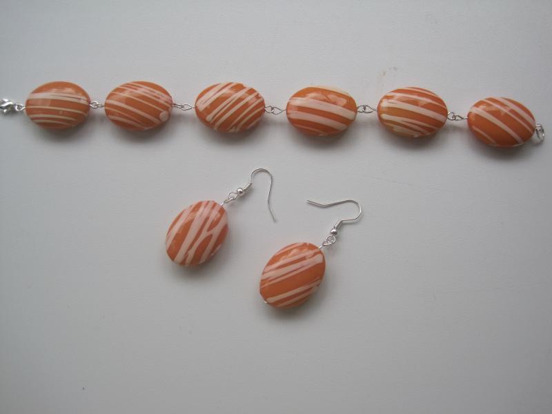 Sada je vyrobena z plastových placiček/oválků oranžové barvy s bílým cákáním.