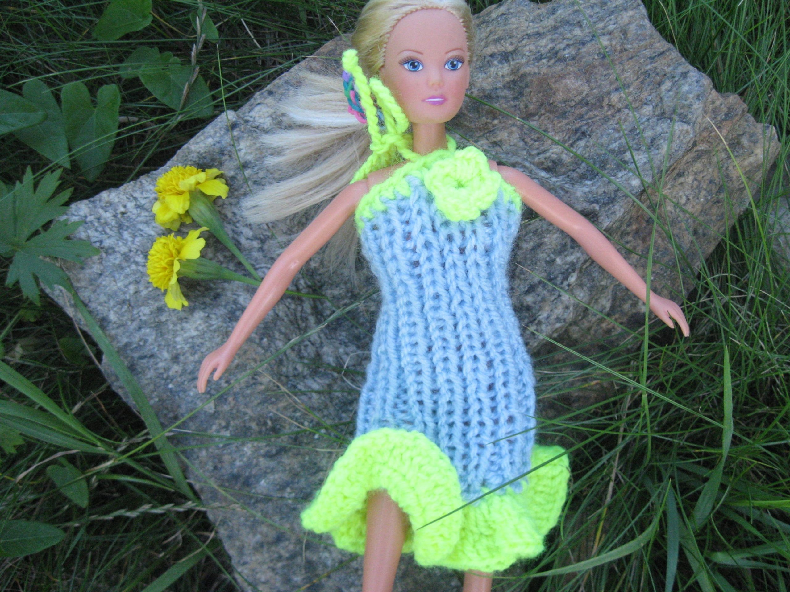 Šatičky na panenku Barbie Slunce a nebe jsou pletené pružným vzorem, sooučástí je též malá kabelka, vše z akrylové příze.