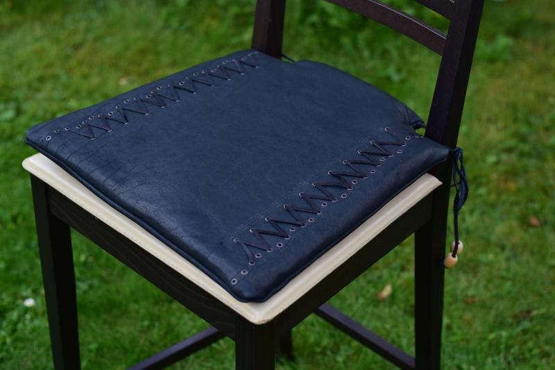 Sedák kožený-vyrobený z hovězinové usně dle vlastního návrhu. Dírky ručně vytloukané, zdobené kovovými kroužky. Výplň tvoří sedákový molitan o tloušťce 3 cm. Zavazování- kožené tkaničky z kůže ukončené dřevěnou kuličkou. Tvar sedáku lze ušít podle přání v barvě tmavě hnědé nebo černé.