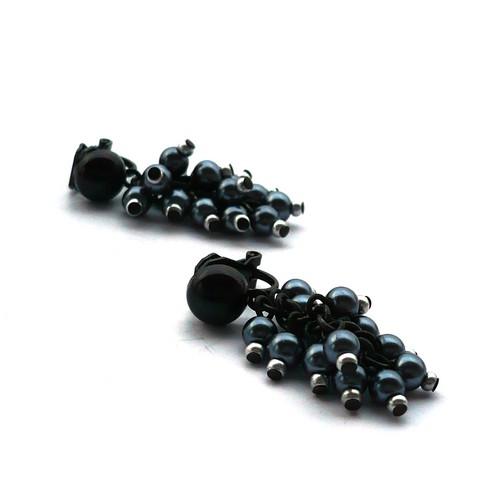 Náušnice jsou tvořeny z šedých voskovaných perliček, které jsou doplněny o drobné světle šedé korálky. Perličky s korálky jsou uspořádány do hrozínku.