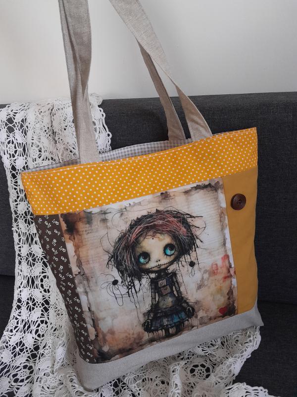 Nabízím  tašku šitou  z kouzelného panelku  doplněnou hnědými a žlutými odstíny.   Zadní strana je hnědo-béžová. Taška je vypodšitá s vnitřní  kapsou . Ozdobila jsem velkým knoflíkem.  Horní lem je dvakrát prošitý aby pěkně držela. Ucha jsou dostatečně dlouhá pro nošení v ruce i přes rameno.