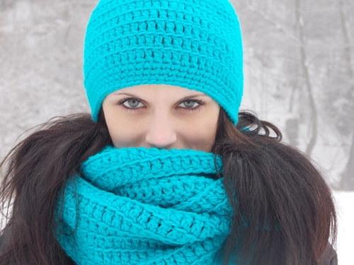Nabízím nákrčník a čepici. Nejen, že vám bude teploučko, ale modrá barvička vás rozzáří. Nákrčník jde dvakrát omotat kolem krku.